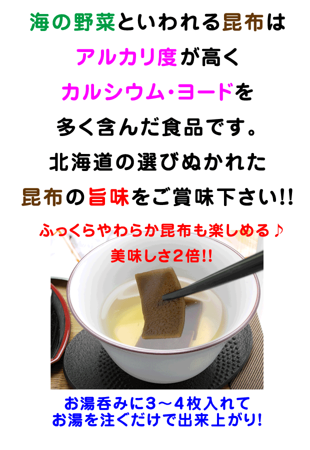 海の野菜といわれる昆布はアルカリ度が高く、カルシウム・ヨードを多く含んだ食品です。北海道の選びぬかれた昆布の旨味をご賞味下さい。
